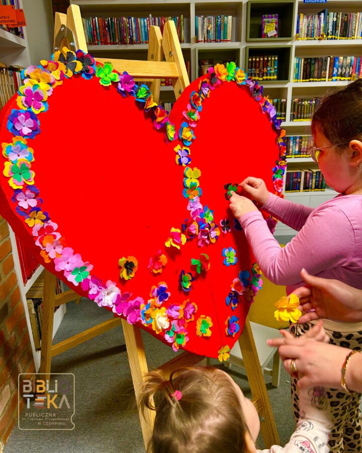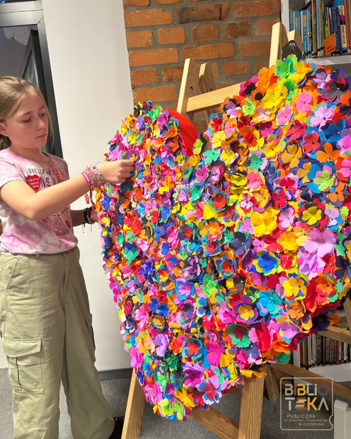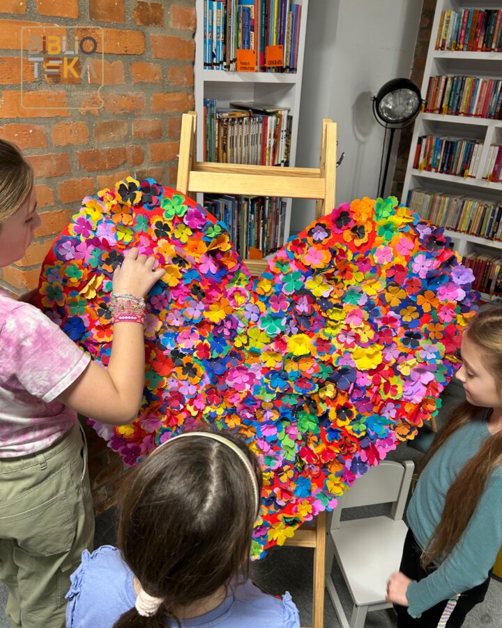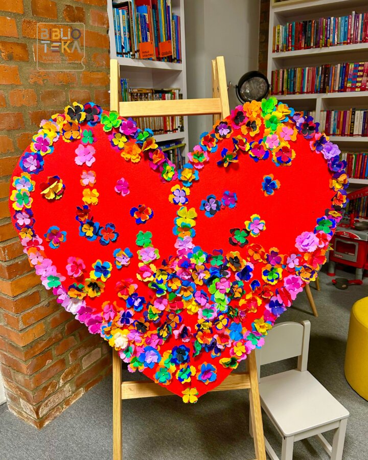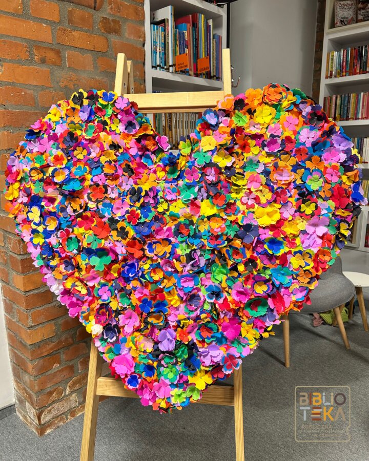Przygotowałyśmy również ogromne serce, które wszyscy odwiedzający mogli wypełniać zrobionymi przez siebie kwiatkami z bibuły. Efekt przerósł nasze najśmielsze oczekiwania. To ogromne serce odzwierciedla serca wszystkich tych, którzy ubarwiali je razem z nami!!