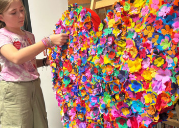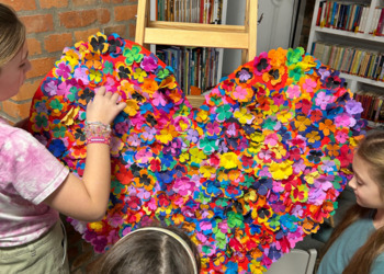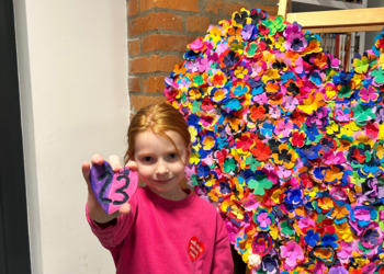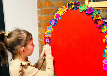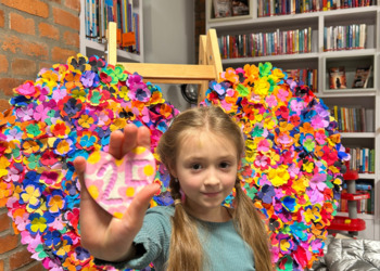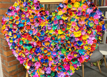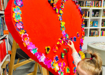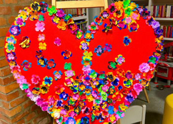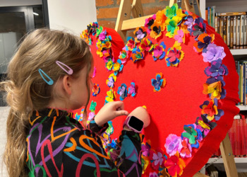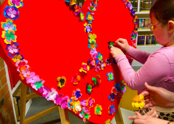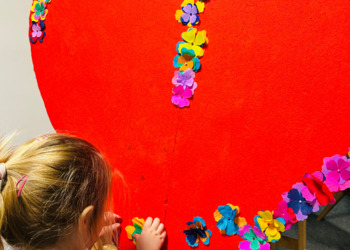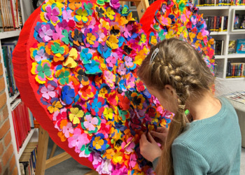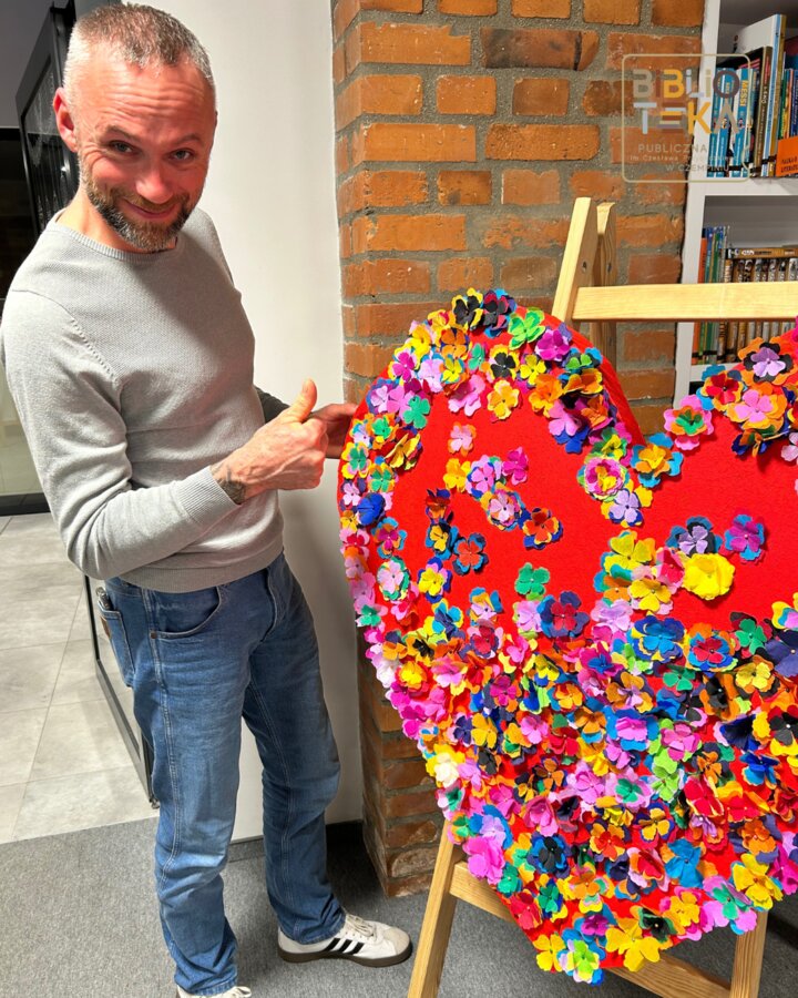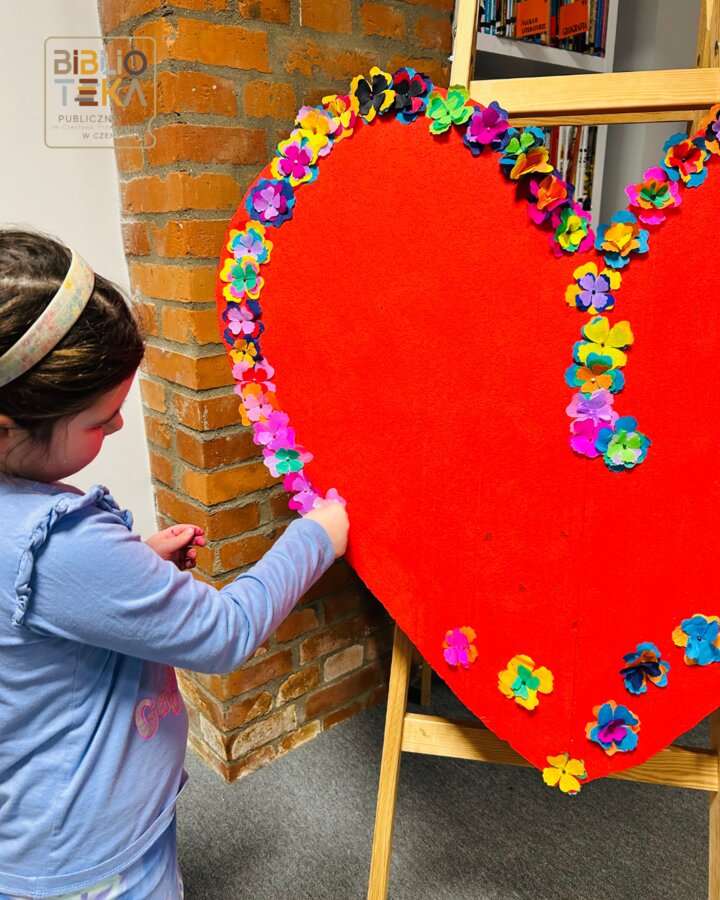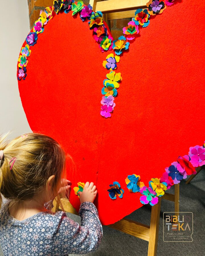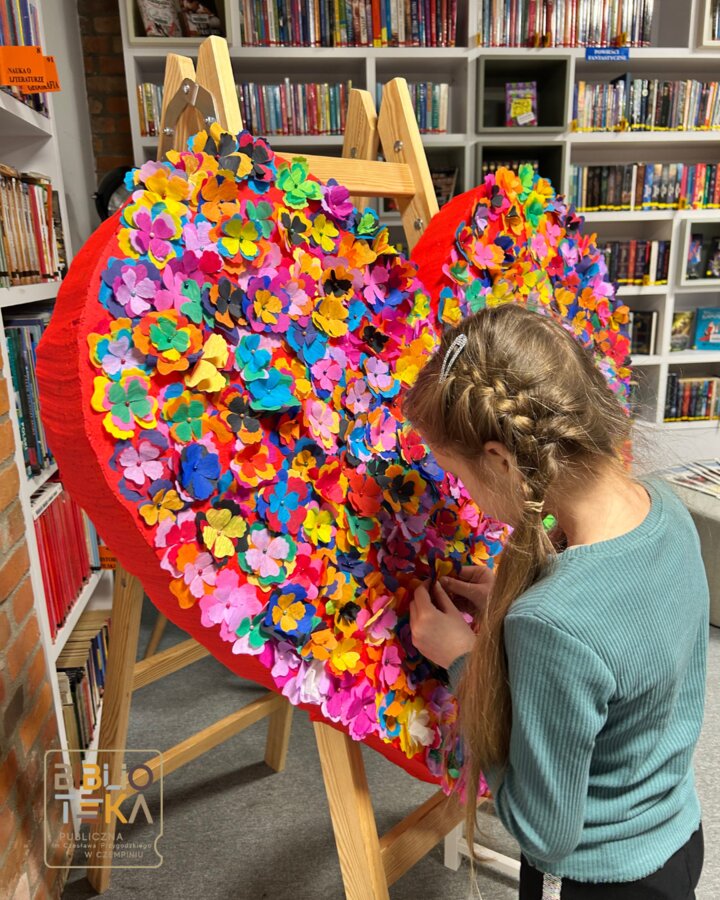 Przygotowałyśmy również ogromne serce, które wszyscy odwiedzający mogli wypełniać zrobionymi przez siebie kwiatkami z bibuły. Efekt przerósł nasze najśmielsze oczekiwania. To ogromne serce odzwierciedla serca wszystkich tych, którzy ubarwiali je razem z nami!!