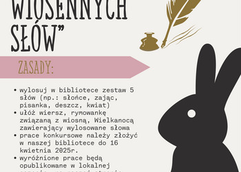 Konkurs polega na wylosowaniu zestawu 5 słów ( losy dostępne w naszej bibliotece ) i ułożeniu wiersza lub rymowanki związanej z wiosną i/lub Wielkanocą zawierając w nich wylosowane słowa. Można użyć odmiany tych słów.