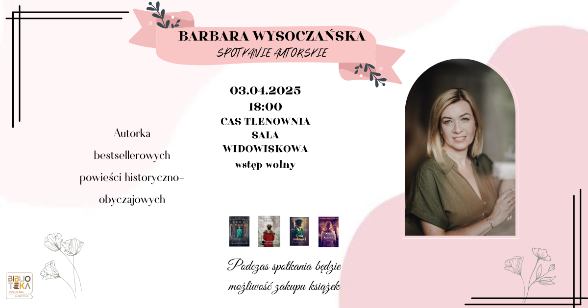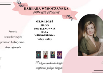 Pragniemy zaprosić Państwa na spotkanie z pisarką Barbarą Wysoczańską, autorką takich książek jak: "Siła kobiet", "Narzeczona nazisty", "Aktoreczka" czy "Cena wolności".