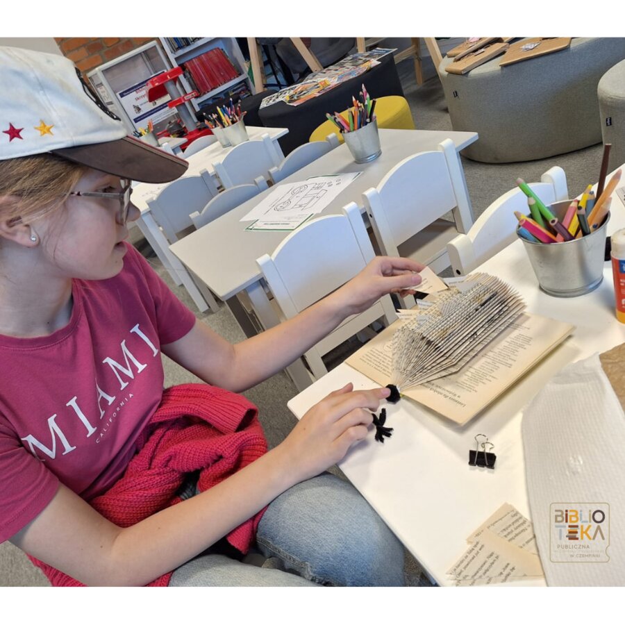 Sporym zainteresowaniem cieszyły się warsztaty origami, na których odwiedzający mieli okazję wykonać zakładki do książek. Wszyscy wykazywali się ogromną kreatywnością i zdolnościami manualnymi. Dzieci z dużym zaangażowaniem i cierpliwością tworzyły zajączki, kotki, myszki i jeżyki oraz zakładki w stylu retro. Czytelnicy mogli także wziąć udział w akcji „ Książka Dotleniona”. Chcieliśmy dzięki temu zmienić podejście do książek, które dotychczas mogły zostać uznane za przestarzałe lub zniszczone. Pokazaliśmy, że stare książki można przekształcić w coś nowego i ciekawego, zamiast po prosty je wyrzucać. Główną techniką jaką zaproponowaliśmy było składanie różnego rodzaju egzemplarzy w różnego rodzaju formy artystyczne. Powstały m.in. budki dla ptaków, jeżyki i myszki.